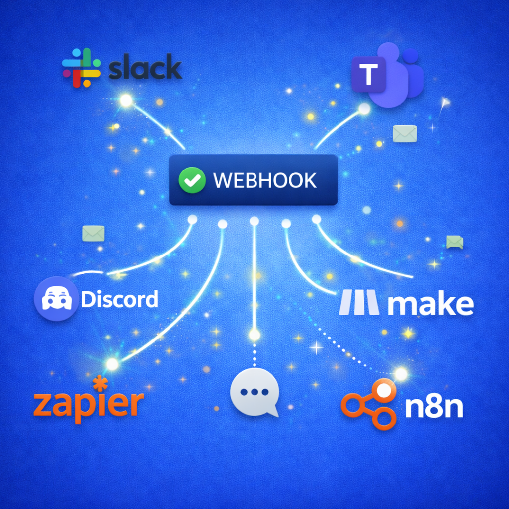Uptivus integrates through webhooks with external apps such as Zapier, Make, n8n, Slack, Teams, Discord, Google Chat, Telegram, and many more.