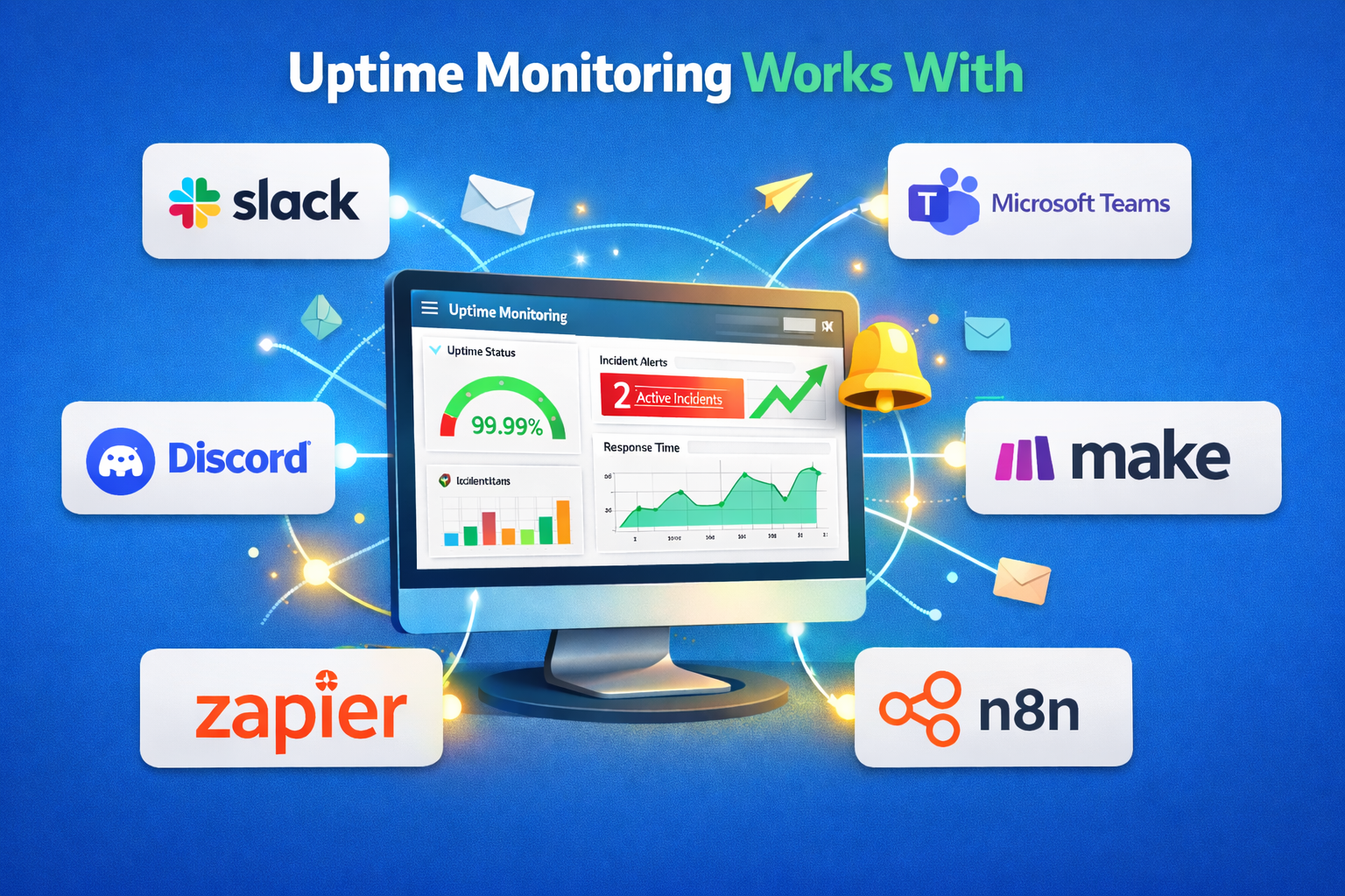 Uptivus integrates through webhooks with external apps such as Zapier, Make, n8n, Slack, Teams, Discord, Google Chat, Telegram, and many more.